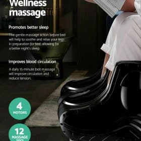 Fodmassageapparatet masserer dine muskler 360 grader og er let at bruge og kan indstilles på flere forskellige trin og vælger du varme til, får du en skøn ekstra lindring af dine trætte fødder og ømme muskler. Massageapparatets æltning og vibrerende bevægelser trænger helt ind i dine muskler i dine fødder, underben og led. Giver ny energi til trætte ben og fødder og styrker blodtilførslen til benene.