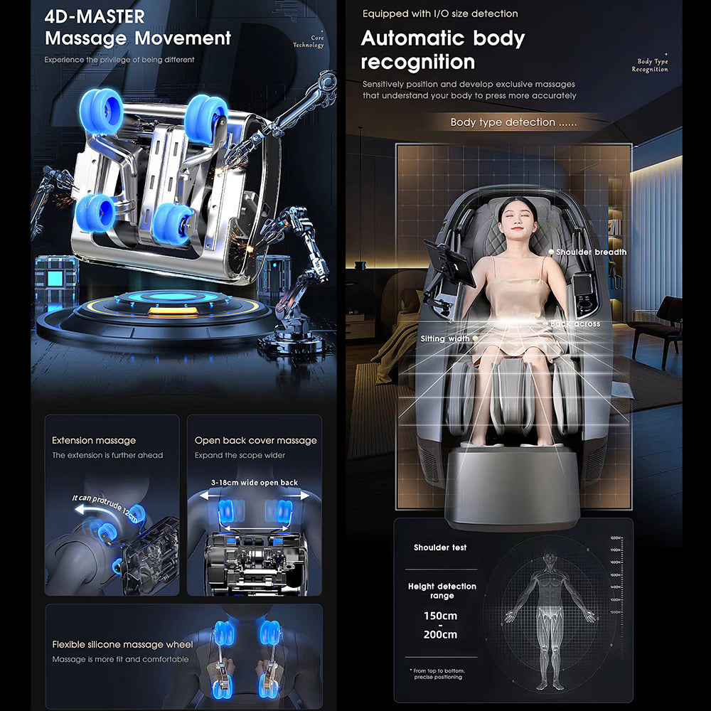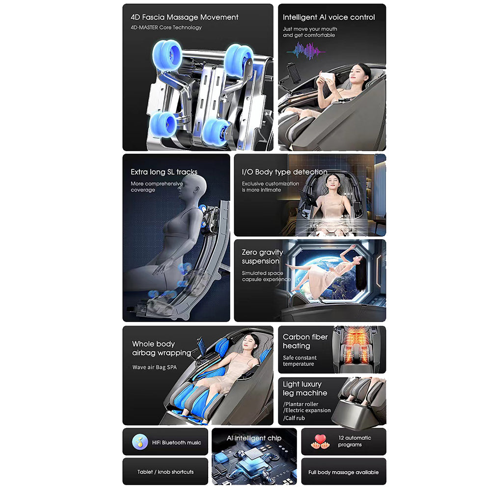Massagestol 988F6 er en avanceret luksusstol, skabt til at levere professionel velvære i hjemmet. Den kombinerer 4D MASTER-massage, intelligent SL-skinne, automatisk kropsscanning, Zero Gravity og et omfattende lufttrykssystem. Sammen med varmeterapi, fod- og benmassage samt moderne styringsmuligheder er stolen et oplagt valg for både afslapning, restitution og behandling.