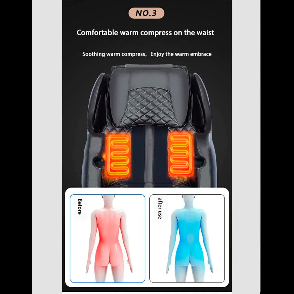 Smart body detection tilpasser massagen til din kropsform, mens Zero Gravity fordeler kropsvægten jævnt for at reducere belastning på muskler og led. Integreret varmeterapi ved lænden kan hjælpe med at lindre spændinger og fremme blodcirkulationen.