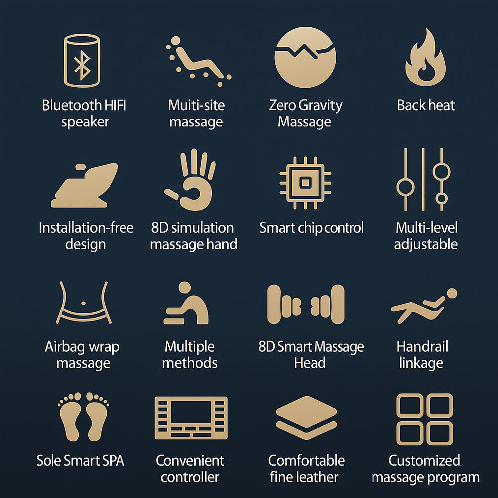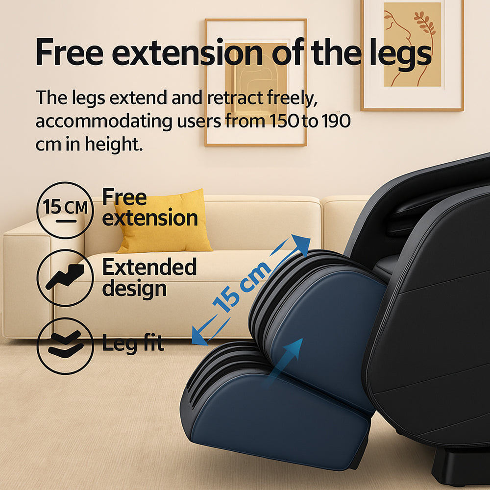 De i alt 28 massagekugler (heraf 18 ved ryg) tilpasser sig din krops konturer og giver effektiv lindring af spændinger i nakke, skuldre, ryg, hofter, ben og fødder. Zero Gravity reducerer trykket på rygsøjlen, mens justerbar fodsektion (op til 15 cm) sikrer korrekt benstøtte til brugere ca. 150–190 cm.
